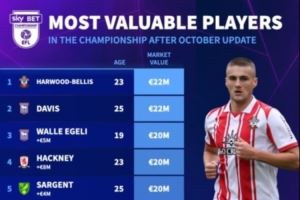 体育资讯10月6日讯 德转更新英冠球员身价,在目前的英冠球员身价中,南安普顿球员贝利斯和伊镇球员戴维斯2200万欧并列第一。